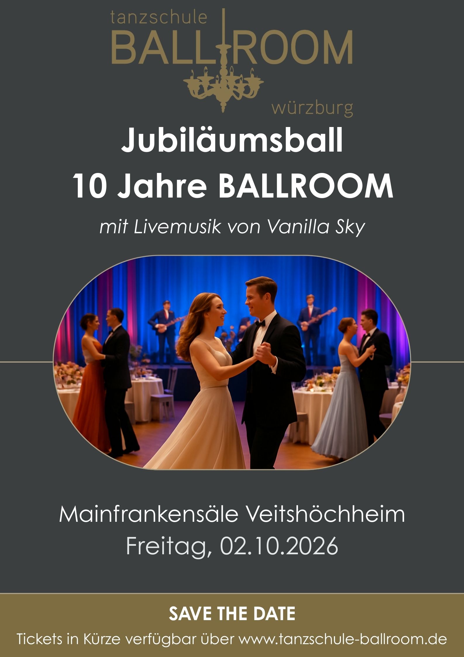 Großer Jubiläumsball – 10 Jahre BALLROOM Gala-Tanzball mit Livemusik Freitag, 02.10.2026 – SAVE THE DATE 19.00 – 23.00 Uhr Das feierliche Highlight unseres Jubiläumsjahes 2026