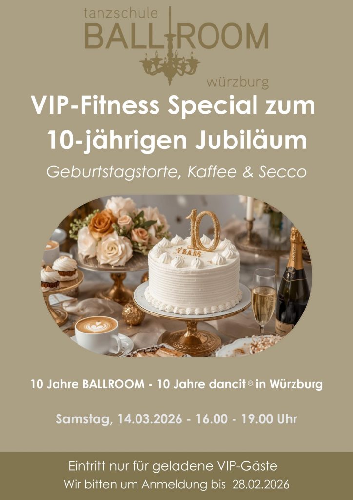 In diesem Jahr feiern wir nicht nur den 10. Geburtstag der Tanzschule, sondern auch 10 Jahre dancit – by C. Polanc in Würzburg. Zu diesem Anlass laden wir alle unsere StammkundInnen aus dem Fitnessbereich zu einer ganz besonderen VIP-Special Party ein.